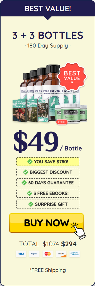 At this moment you can order Kerassentials supplement for 80% OFF + FREE Shipping + 3 Free Ebooks. This is a Limited-Time Offer and it won’t be available for long.